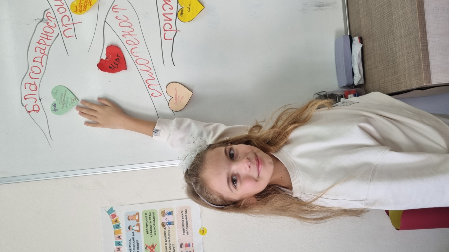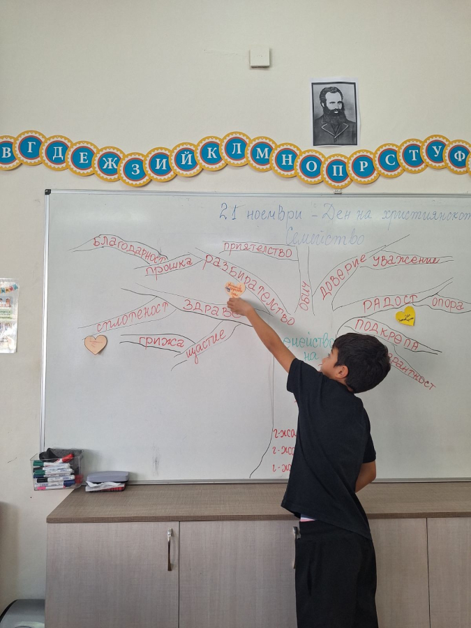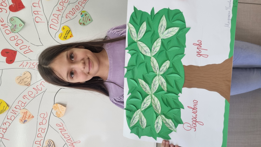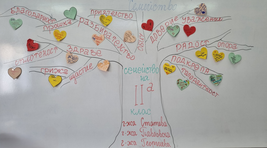 Заедно, учители и ученици, създадохме наше „Дърво на ценностите“, върху което децата поставиха сърца с думи, които описват защо обичат своето семейство: