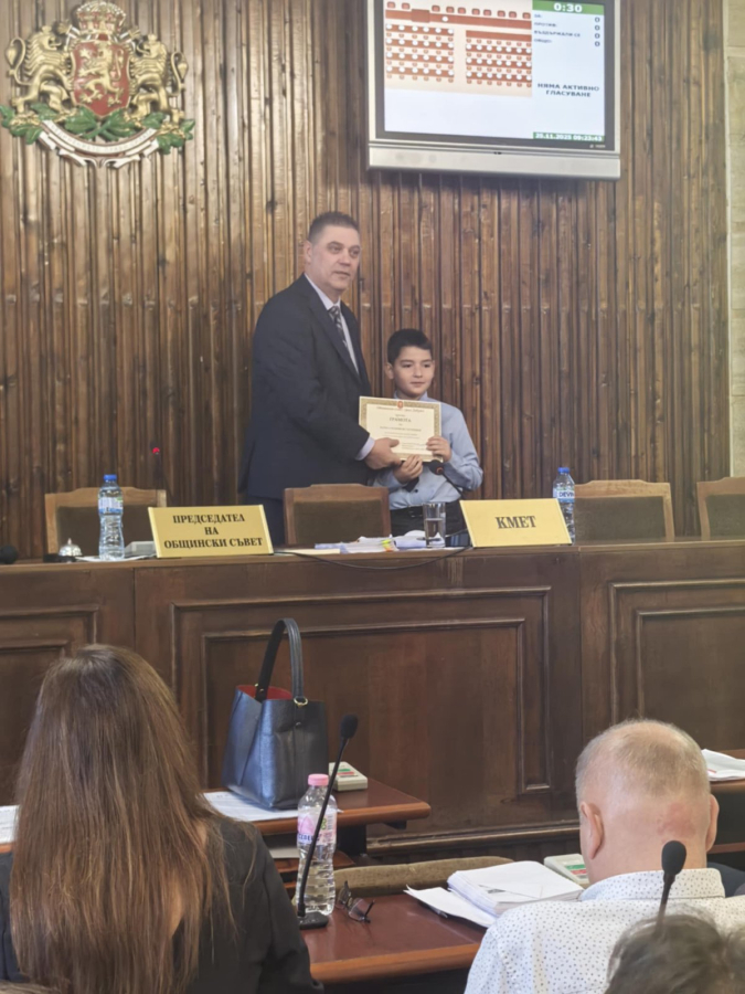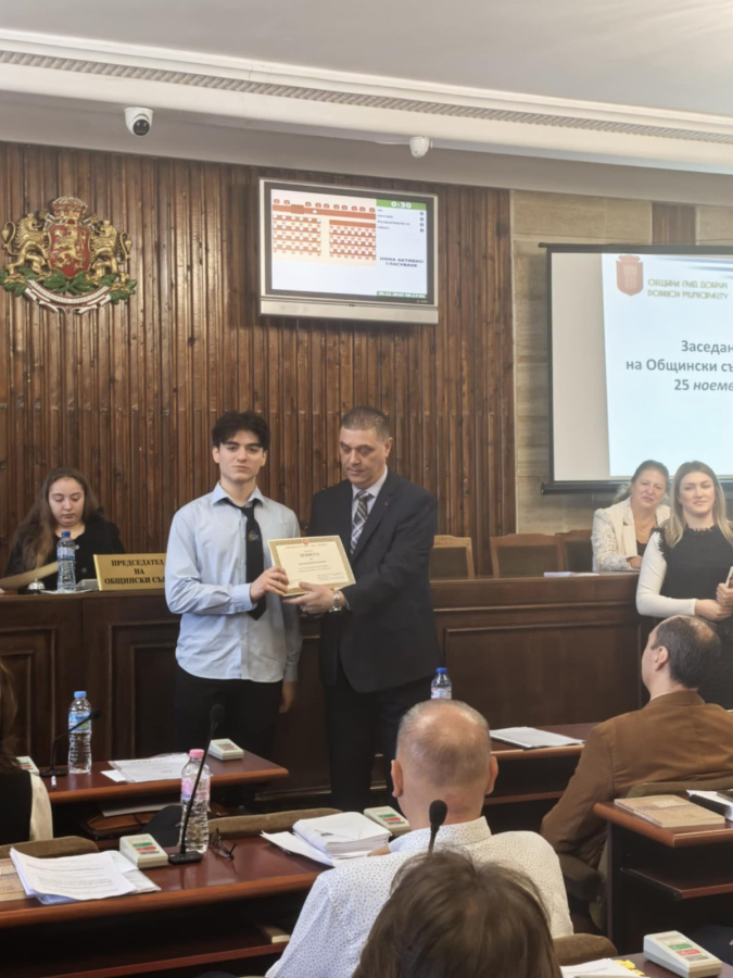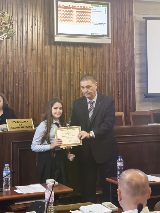 На тържествена церемония, проведена днес преди началото на сесията на Общински съвет град Добрич, връчиха грамоти на отличените в национални олимпиади и състезания ученици. От нашето училище награди получиха: